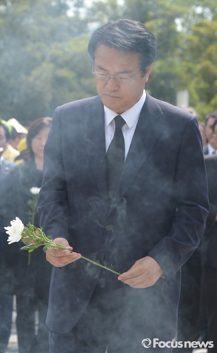 (김해=포커스뉴스) 23일 오후 경남 김해 봉하마을에서 엄수된 故 노무현 전 대통령 서거 7주기 추도식을 마친 뒤 정진석 새누리당 원내대표가 묘역 참배 및 헌화를 하고 있다.
