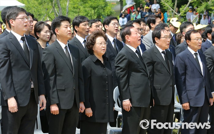 (김해=포커스뉴스) 23일 오후 경남 김해 봉하마을에서 엄수된 故 노무현 전 대통령 서거 7주기 추도식에 참석한 내빈들이 애국가를 부르고 있다. 앞줄 오른쪽부터 이해찬 노무현재단 이사장, 임채정, 김원기 전 국회의장, 노 전 대통령 부인 권양숙 여사, 장남 건호 씨, 김홍걸 더불어민주당 국민통합위원장.