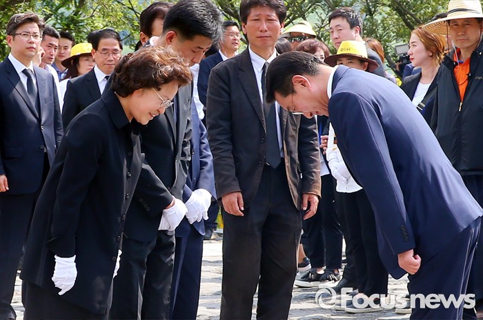 (김해=포커스뉴스) 23일 오후 경남 김해 봉하마을에서 엄수된 故 노무현 전 대통령 서거 7주기 추도식을 마친 뒤 현기환(오른쪽) 청와대 정무수석이 묘역 참배 및 헌화한 뒤 노 전 대통령 부인 권양숙(왼쪽) 여사, 장남 건호 씨와 인사하고 있다.