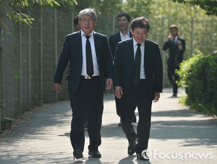 (김해=포커스뉴스) 23일 오후 경남 김해 봉하마을에서 엄수된 故 노무현 전 대통령 서거 7주기 추도식에 참석한 조응천(왼쪽), 정재호 더불어민주당 당선인이 노 전 대통령 사저를 방문한 뒤 나서고 있다.