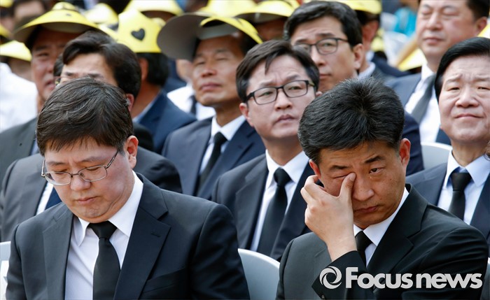 (김해=포커스뉴스) 23일 오후 경남 김해 봉하마을에서 엄수된 故 노무현 전 대통령 서거 7주기 추도식에 참석한 노 전 대통령의 장남 건호 씨가 눈물을 흘리고 있다. 왼쪽은 김홍걸 더불어민주당 국민통합위원장.