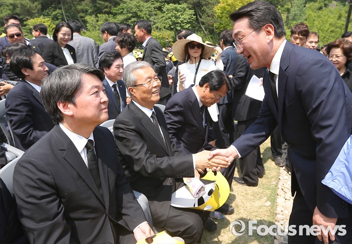 (김해=포커스뉴스) 23일 오후 경남 김해 봉하마을에서 엄수된 故 노무현 전 대통령 서거 7주기 추도식에 참석한 현기환(오른쪽 첫번째) 청와대 정무수석이 김종인(왼쪽 두번째) 더불어민주당 비대위 대표와 인사하고 있다.
