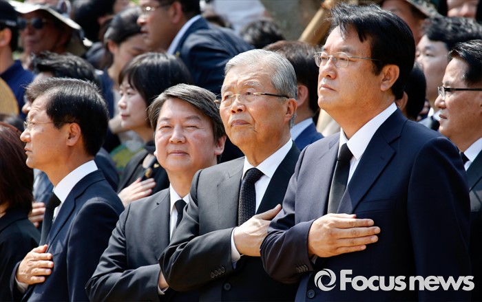 (김해=포커스뉴스) 23일 오후 경남 김해 봉하마을에서 엄수된 故 노무현 전 대통령 서거 7주기 추도식에 참석한 정진석(오른쪽부터) 새누리당 원내대표, 김종인 더불어민주당 비대위 대표, 안철수 국민의당 상임공동대표, 천정배 공동대표가 국기에 대한 경례를 하고 있다.