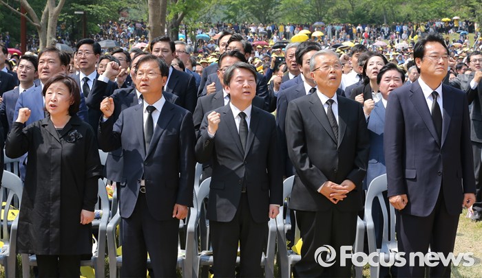 (김해=포커스뉴스) 23일 오후 경남 김해 봉하마을에서 엄수된 故 노무현 전 대통령 서거 7주기 추도식에 참석한 내빈들이 임을 위한 행진곡을 부르고 있다. 앞줄 오른쪽부터 정진석 새누리당 원내대표, 김종인 더불어민주당 비대위 대표, 안철수 국민의당 상임공동대표, 천정배 공동대표, 심상정 정의당 상임대표.