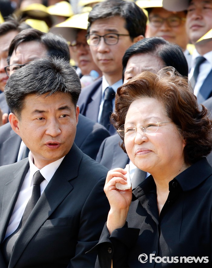 (김해=포커스뉴스) 23일 오후 경남 김해 봉하마을에서 엄수된 故 노무현 전 대통령 서거 7주기 추도식에 참석한 노 전 대통령 부인 권양숙(오른쪽) 여사, 장남 건호 씨가 대화하고 있다.