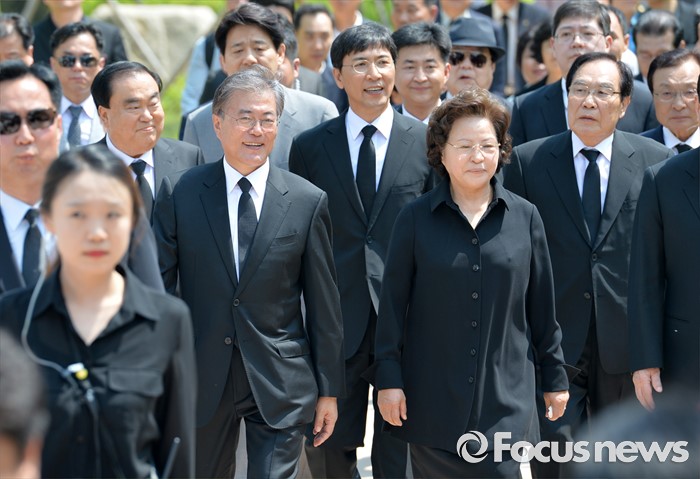 (김해=포커스뉴스) 23일 오후 경남 김해 봉하마을에서 엄수된 故 노무현 전 대통령 서거 7주기 추도식에 노 전 대통령의 부인 권양숙(오른쪽) 여사와 문재인 더불어민주당 전 대표가 참석하고 있다.