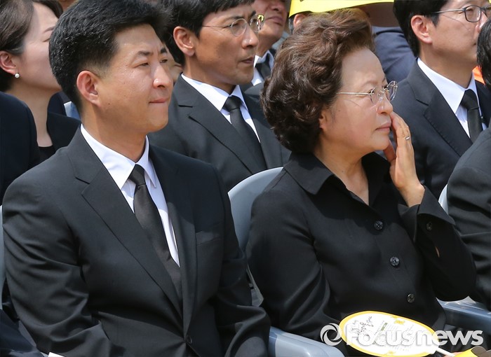 (김해=포커스뉴스) 23일 오후 경남 김해 봉하마을에서 엄수된 故 노무현 전 대통령 서거 7주기 추도식에 참석한 노 전 대통령 부인 권양숙 여사가 눈물을 흘리고 있다. 오른쪽은 장남 건호 씨.