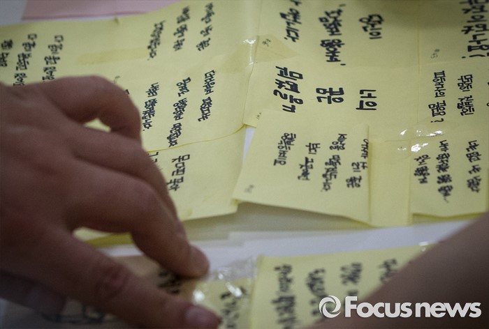 (서울=포커스뉴스) 23일 오후 서울 동작구 서울여성플라자 로비에 마련된 추모 전시장에서 여성가족재단 직원들이 강남역 묻지마 살인 피해자 추모 기록물들을 정리하고 있다.