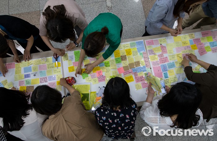 (서울=포커스뉴스) 23일 오후 서울 동작구 서울여성플라자 로비에 마련된 추모 전시장에서 여성가족재단 직원들이 강남역 묻지마 살인 피해자 추모 기록물들을 정리하고 있다.