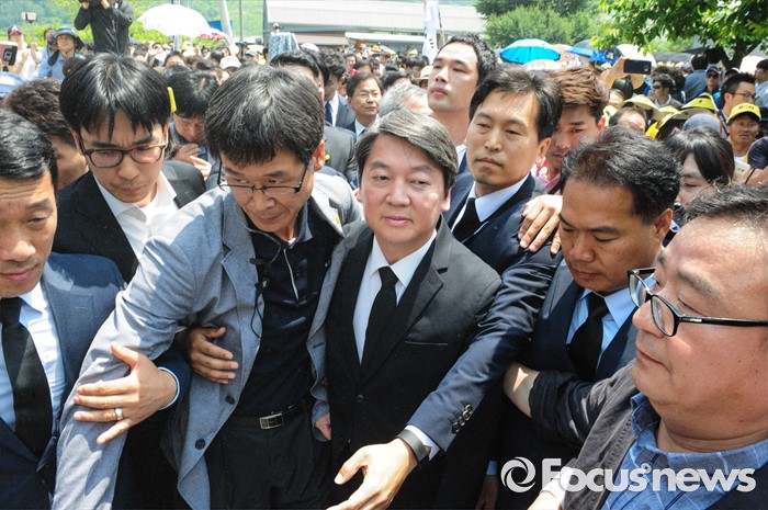 이들 경호인력은 일부 지지자들이 '물벼락'을 뿌리지 않을까 염려하며 우산까지 받쳐들고 안 대표를 호위하는 모습을 보이기도 했다.23일 오후 경남 김해 봉하마을에서 엄수된 故 노무현 전 대통령 서거 7주기 추도식에 안철수 국민의당 상임공동대표가 참석하고 있다. 2016.05.23 김흥구 기자