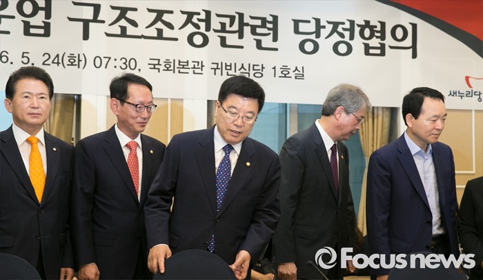 (서울=포커스뉴스) 24일 오전 서울 여의도 국회 귀빈식당에서 열린 조선·해운업 구조조정 관련 당정협의에 참석한 김광림 새누리당 정책위의장, 임종룡 금융위원장 등 참석자들이 취재진을 향해 포즈를 취한 뒤 자리로 향하고 있다. 왼쪽부터 김한표 새누리당 의원, 김도읍 원내수석부대표, 김광림 정책위의장, 임종룡 금융위원장, 성일종 원내부대표.