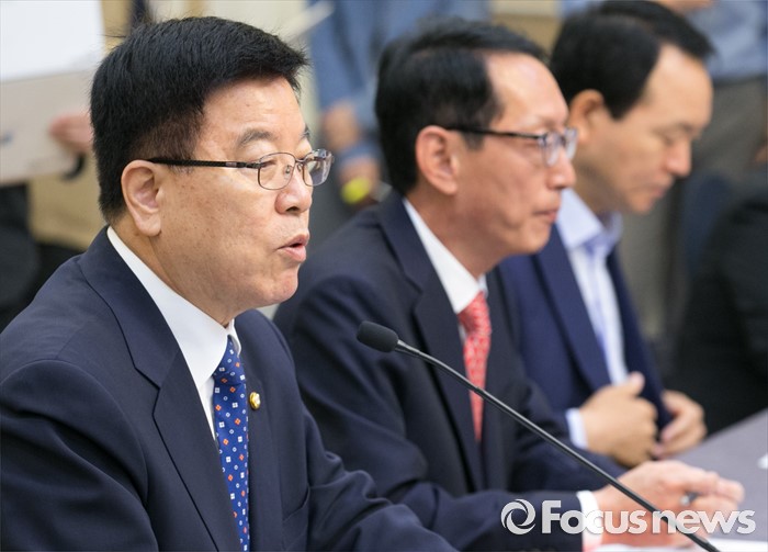 (서울=포커스뉴스) 24일 오전 서울 여의도 국회 귀빈식당에서 열린 조선·해운업 구조조정 관련 당정협의에 참석한 김광림 새누리당 정책위의장이 모두발언을 하고 있다.