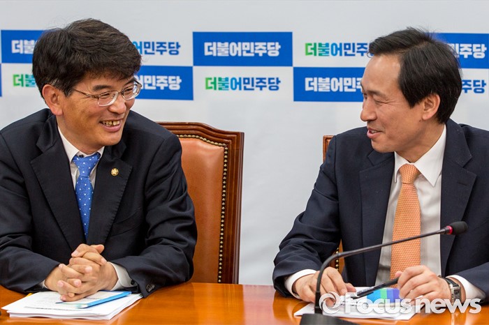 (서울=포커스뉴스) 우상호(오른쪽) 더불어민주당 원내대표와 박완주 더불어민주당 원내수석부대표가 24일 오전 서울 여의도 국회의서 열린 원내대책회의에 참석해 대화를 나누고 있다.