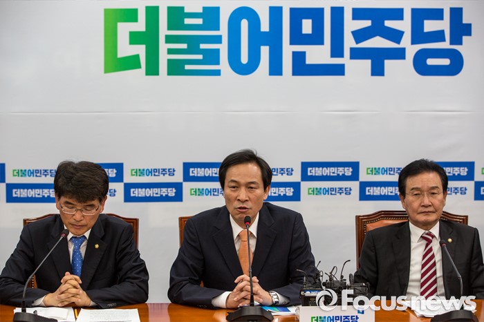 (서울=포커스뉴스) 우상호(가운데) 더불어민주당 원내대표가 24일 오전 서울 여의도 국회의서 열린 원내대책회의에 참석해 모두발언 하고 있다.