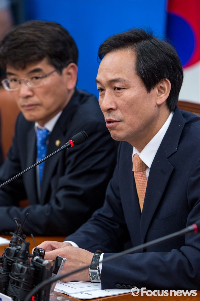 (서울=포커스뉴스) 우상호 더불어민주당 원내대표가 24일 오전 서울 여의도 국회의서 열린 원내대책회의에 참석해 모두발언 하고 있다.