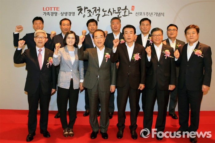 (서울=포커스뉴스) 롯데는 지난 23일 잠실 롯데호텔에서 ‘롯데 상생경영 및 창조적 노사문화 선포 1주년’ 기념식을 가졌다고 24일 밝혔다..
