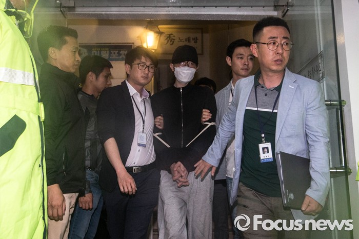(서울=포커스뉴스) '묻지마 살인'사건의 피의자 김모(34)씨가 24일 오전 서울 서초구 서초대로의 한 상가건물에서 현장검증을 마치고 경찰차로 이동하고 있다.