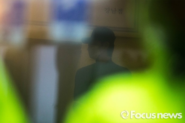 (서울=포커스뉴스) '묻지마 살인'사건의 피의자 김모(34)씨가 24일 오전 서울 서초구 서초대로의 한 상가건물에서 현장검증을 마치고 경찰차로 이동하고 있다.