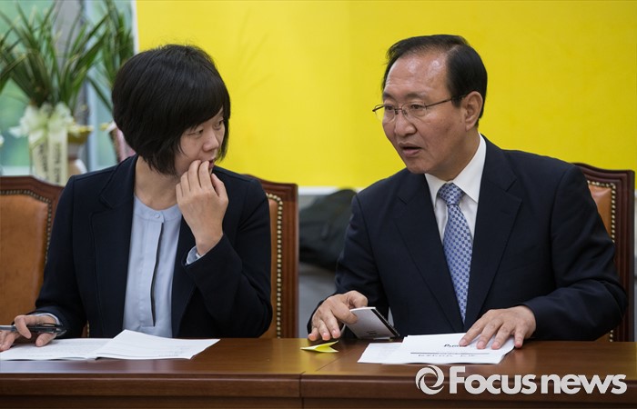 (서울=포커스뉴스) 노회찬(오른쪽) 정의당 원내대표가 24일 오전 서울 여의도 국회에서 열린 당선자 총회에 참석해 이정미 당선인과 대화하고 있다.