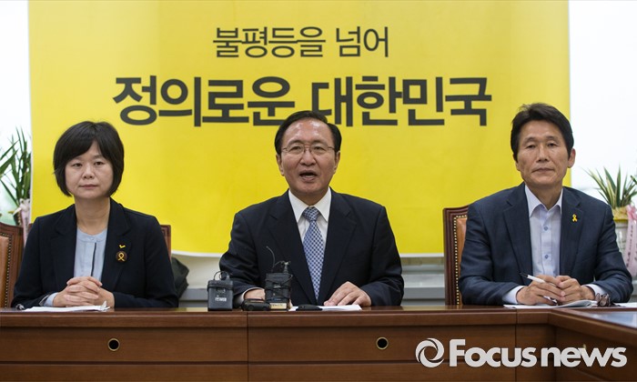 (서울=포커스뉴스) 노회찬 정의당(가운데) 원내대표가 24일 오전 서울 여의도 국회에서 열린 당선자 총회에 참석해 발언하고 있다. 왼쪽부터 이정미 당선인, 노 원내대표, 윤소하 당선인