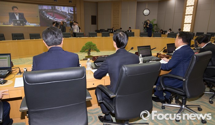 (세종=포커스뉴스) 유일호 경제부총리 겸 기획재정부장관이 24일 오전 세종시 정부세종청사 국무회의장에서 서울-세종 영상회의로 열린 국무회의를 주재하고 있다.