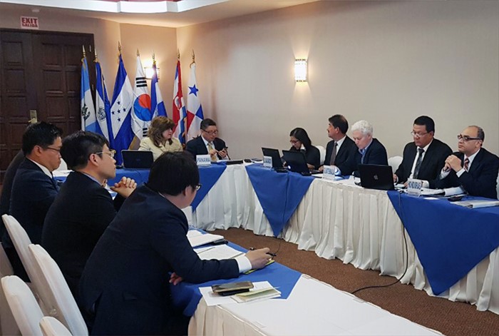 (서울=포커스뉴스) 여한구 산업통상자원부 FTA정책관이 23일(현지시간) 온두라스 수도인 테구시갈파에서 산업부, 기재부, 농축산부, 해수부 등 관계부처로 구성된 정부대표단의 한국측 수석대표로 참석해, 멜빈 E. 레돈도(Melvin E. Redondo) 온두라스 경제통합통상차관을 수석대표로 중미 6개국 정부대표단과'한-중미 FTA 제4차 협상'을 개최하고 있다. <사진제공=산업통상자원부>