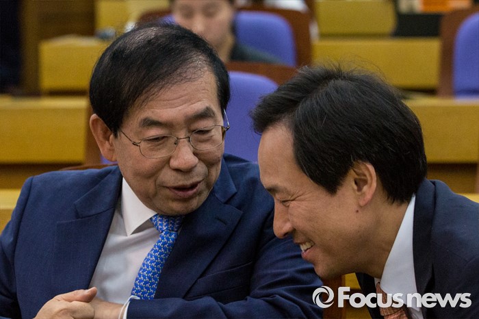 | △ 대화 나누는 우상호 원내대표-박원순 서울시장 |