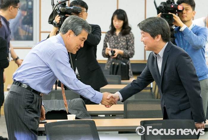 (서울=포커스뉴스) 24일 오전 서울 여의도 국회 의원회관에서 열린 국민의당 6차 정책역량강화 워크숍에 참석한 안철수(오른쪽) 상임공동대표와 이상돈 최고위원이 인사하고 있다.