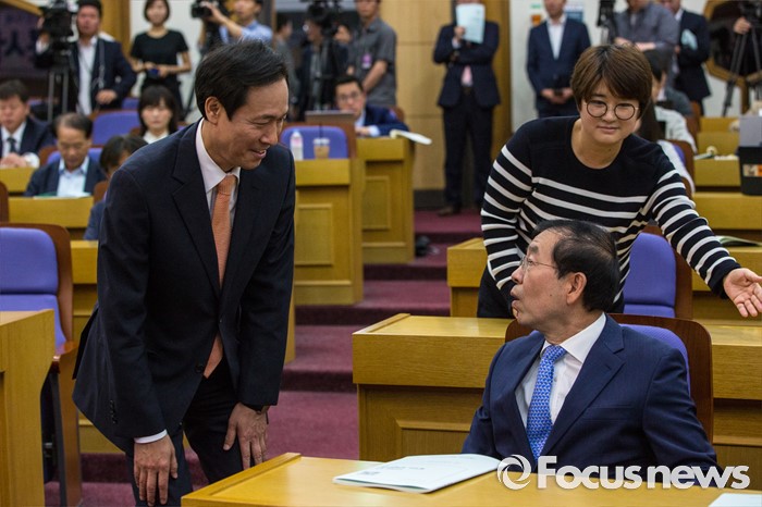(서울=포커스뉴스) 우상호(왼쪽) 더불어민주당 원내대표와 박원순 서울시장이 24일 오전 서울 여의도 국회의원회관에서 열린 '지자체장 초청 일자리 정책 콘서트'에 참석해 인사 하고 있다.