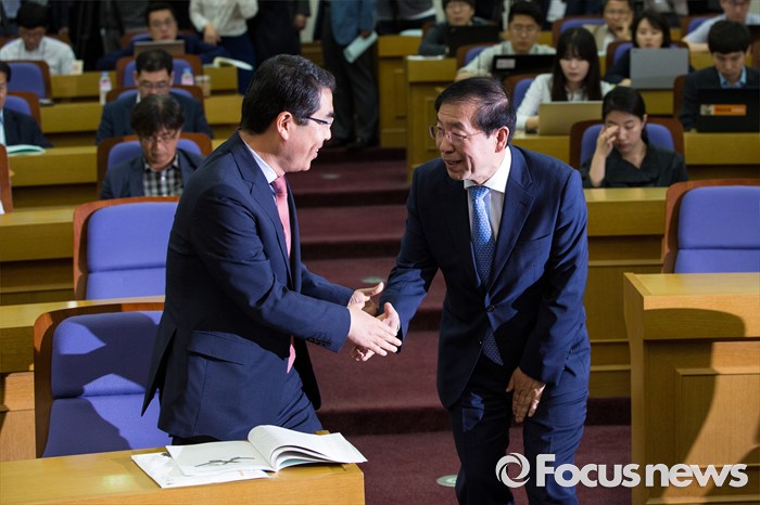 (서울=포커스뉴스) 박원순 서울시장이 24일 오전 서울 여의도 국회의원회관에서 열린 '더불어민주당, 지자체장 초청 일자리 정책 콘서트'에 참석한 지방자치단체장과 악수 하고 있다.