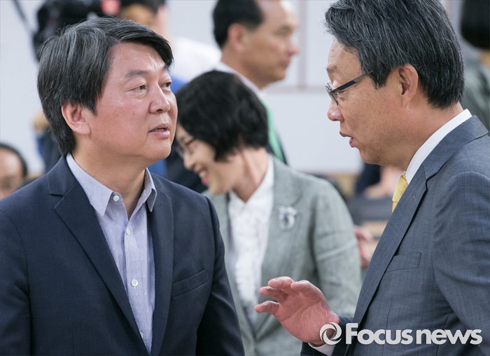 (서울=포커스뉴스) 24일 오전 서울 여의도 국회 의원회관에서 열린 국민의당 6차 정책역량강화 워크숍에 참석한 안철수(왼쪽) 상임공동대표와 김성식 정책위의장이 대화하고 있다.