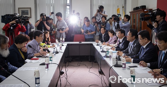 (서울=포커스뉴스) 정진석 새누리당 원내대표와 권성동 환노위 여당 간사가 24일 오전 서울 여의도 국회에서 가습기살균제 피해자와 가족 모임 면담을 하고 있다.