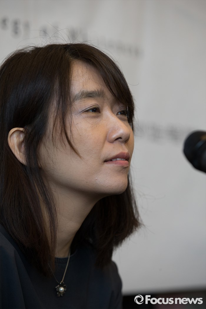 (서울=포커스뉴스) 소설' 채식주의자'로 세계 3대 문학상인 맨부커상을 수상한 한강이 24일 오전 서울 마포구 카페 꼼마에서 열린 신작소설 '흰' 출간 기자간담회에서 취재진의 질문에 답하고 있다.