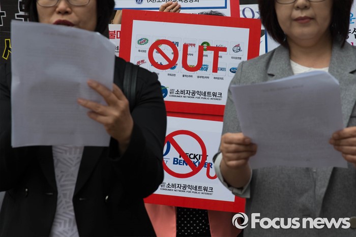 (서울=포커스뉴스) 24일 오후 서울 용산구 이마트 용산역점 앞에서 소비자단체들이 옥시 가습기 살균제 피해에 대한 사과와 보상, 옥시제품 유통업체에서 철수를 촉구하며 기자간담회를 갖고 있다.