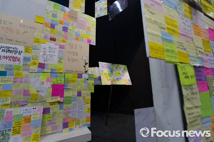 (서울=포커스뉴스) 24일 오전 강남역 인근 주점 화장실 살인사건 피해자 추모 공간이 옮겨진 서울시청 시민청에 추모 쪽지가 전시되어 있다.
