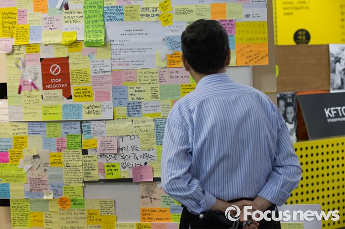 (서울=포커스뉴스) 강남역 인근 주점 화장실 살인사건 피해자 추모 공간이 옮겨진 서울시청 시민청에서 24일 오전 한 시민이 추모글귀를 살펴보고 있다.