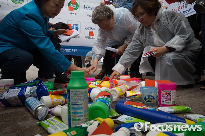 (서울=포커스뉴스) 24일 오후 서울 용산구 이마트 용산역점 앞에서 소비자단체들이 옥시 가습기 살균제 피해에 대한 사과와 보상, 옥시제품 유통업체에서 철수를 촉구하며 옥시제품에 빨간딱지를 붙이는 퍼포먼스를 하고 있다.
