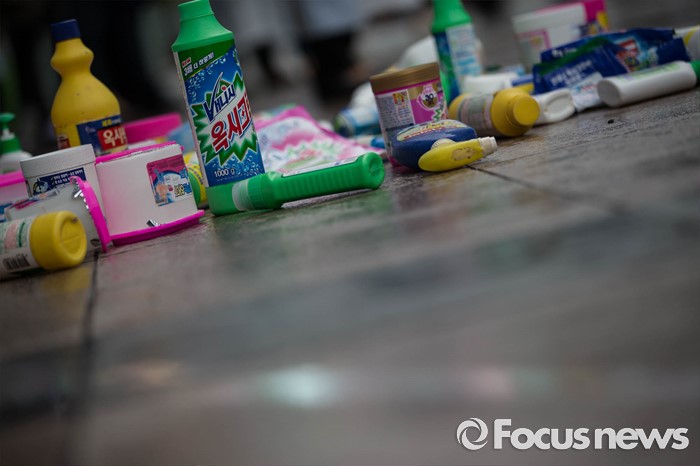 (서울=포커스뉴스) 24일 오후 서울 용산구 이마트 용산역점 앞에서 소비자단체들이 옥시 가습기 살균제 피해에 대한 사과와 보상, 옥시제품 유통업체에서 철수를 촉구하며 옥시제품을 바닥에 버리고 있다.
