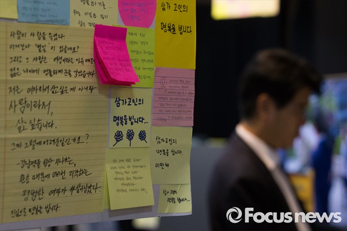 (서울=포커스뉴스) 강남역 인근 주점 화장실 살인사건 피해자 추모 공간이 옮겨진 서울시청 시민청에서 24일 오전 시민들이 추모글귀를 살펴보고 있다.