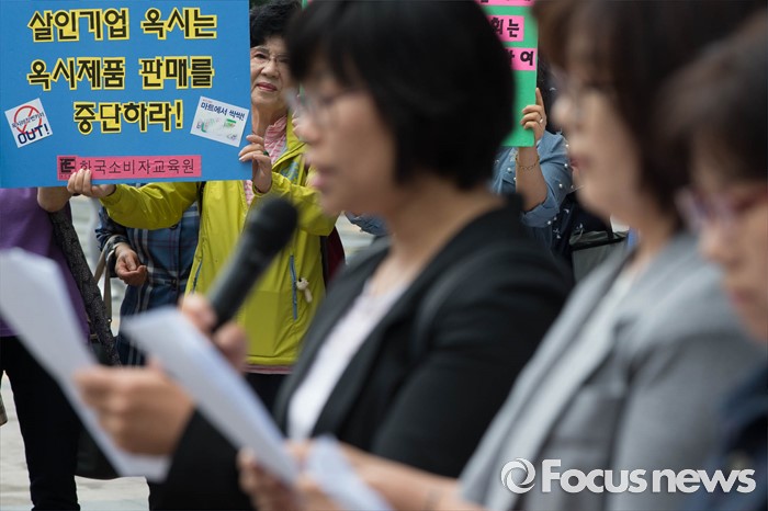 (서울=포커스뉴스) 24일 오후 서울 용산구 이마트 용산역점 앞에서 소비자단체들이 옥시 가습기 살균제 피해에 대한 사과와 보상, 옥시제품 유통업체에서 철수를 촉구하며 기자간담회를 갖고 있다.
