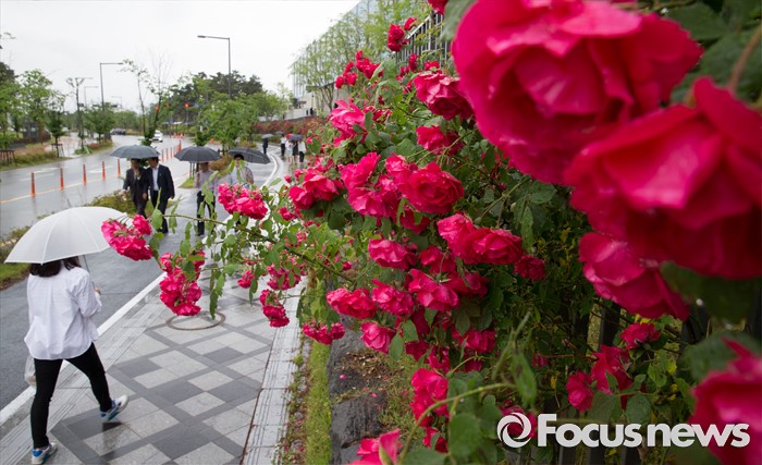 (세종=포커스뉴스) 전국적으로 비가 내린 24일 오후 세종시 정부세종청사 국무총리실 울타리에 핀 장미 사이로 청사 직원들이 우산을 쓰고 지나고 있다.
