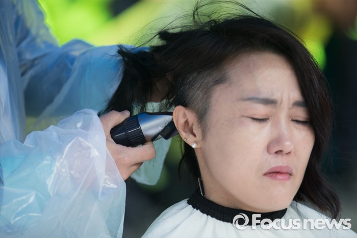 (서울=포커스뉴스) 24일 오전 서울 중구 서울시청 앞에서 열린 '서울시 발달장애인 부모 무기한 삭발결의 선포 기자회견'에 참석한 김남연 전국장애인부모연대 서울지부장이 삭발하고 있다.