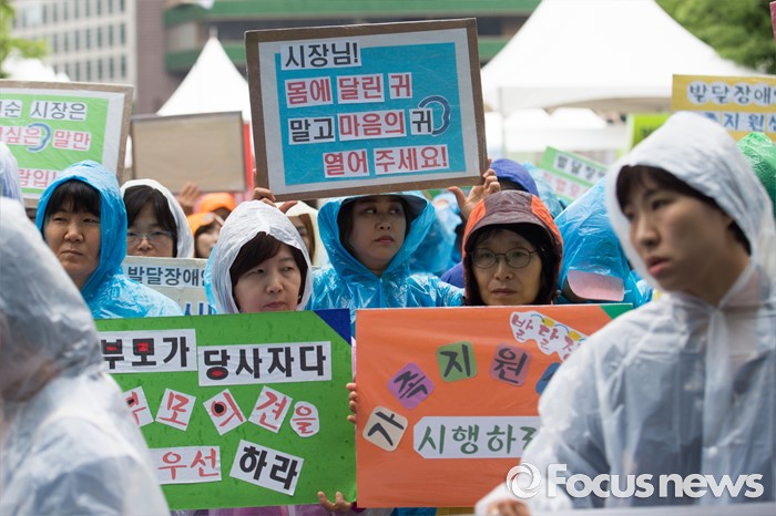 (서울=포커스뉴스) 24일 오전 서울 중구 서울시청 앞에서 열린 '서울시 발달장애인 부모 무기한 삭발결의 선포 기자회견'에 참석한 전국장애인부모연대 회원들이 손피켓을 들고 있다.