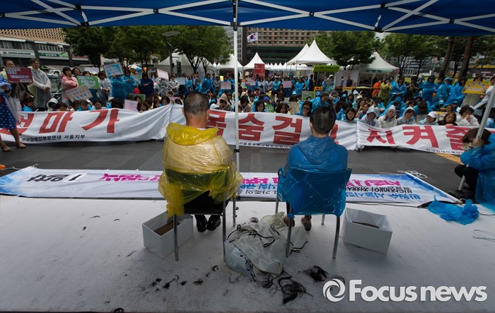 (서울=포커스뉴스) 24일 오전 서울 중구 서울시청 앞에서 열린 '서울시 발달장애인 부모 무기한 삭발결의 선포 기자회견'에 참석한 윤종술(오른쪽) 전국장애인부모연대 대표와 김남연 서울지부장이 삭발후 자리에 앉아 있다.