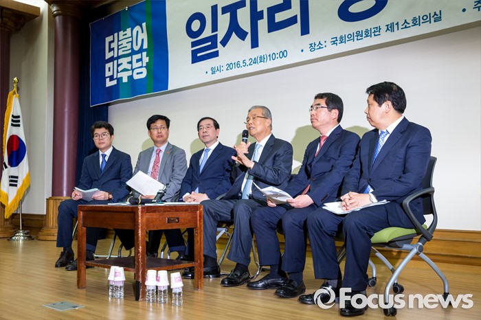 (서울=포커스뉴스) 김종인(왼쪽 네 번째) 더불어민주당 비상대책위 대표가 24일 오전 서울 여의도 국회의원회관에서 열린 '더불어민주당, 지자체장 초청 일자리 정책 콘서트'에 참석해 발언 하고 있다.