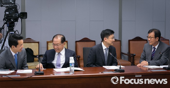 (서울=포커스뉴스) 24일 오후 서울 여의도 국회 의원회관에서 열린 국회선진화법 평가와 발전 방안 토론회에 참석한 여야 의원들이 대화하고 있다. 오른쪽부터 원혜영 더불어민주당 의원, 김세연, 황우여 새누리당 의원, 김병관 더불어민주당 당선인.