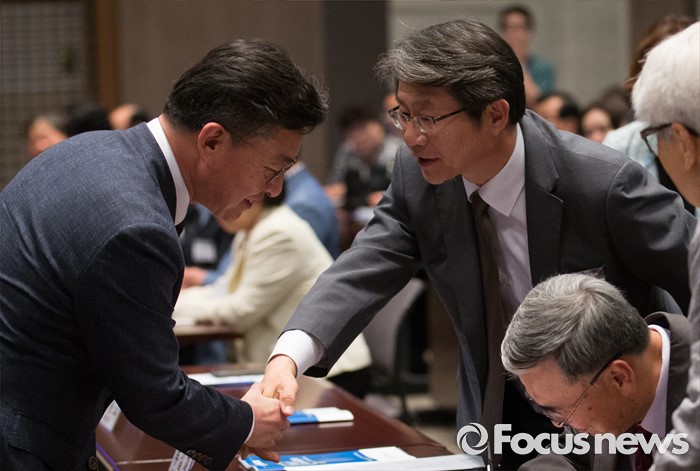 (서울=포커스뉴스) 천안함 피격사건을 계기로 5·24 대북제재 조치가 취해진 지 6년이 되는 날인 24일 오후 서울 중구 프레스센터에서 열린 '통일공감포럼 발족식 및 통일공감대화'에 참석한홍용표(왼쪽) 통일부 장관 류길재 전 통일부 장관이 악수하고 있다.