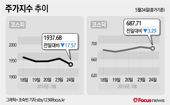 (서울=포커스뉴스) 24일 코스피지수는 전날 보다 0.90%(17.57포인트) 내린 1937.68에 장을 마쳤다. 코스닥지수는 전일 대비 0.48%(3.29포인트) 내린 687.71에 마감했다.