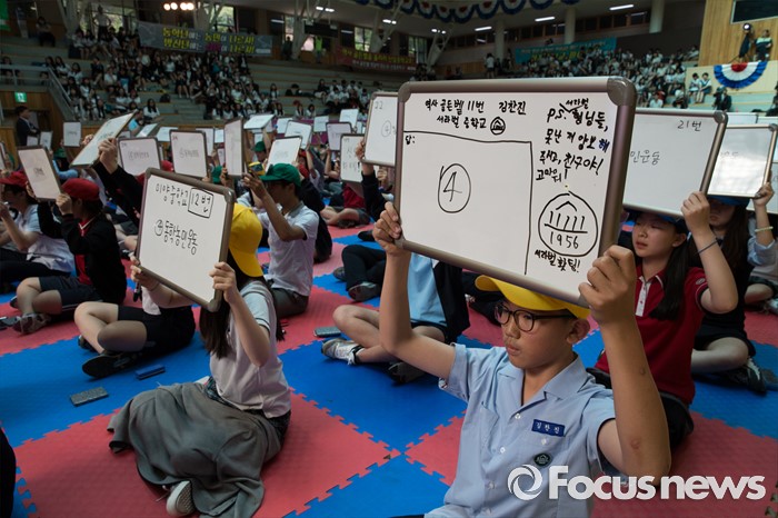 (서울=포커스뉴스) 24일 오후 서울 강북구 신일중학교 체육관에서 열린 근현대사기념관 개관 기념 '역사 골든벨'에 참석한 학생들이 본선 골든벨 퀴즈를 풀고 있다.
