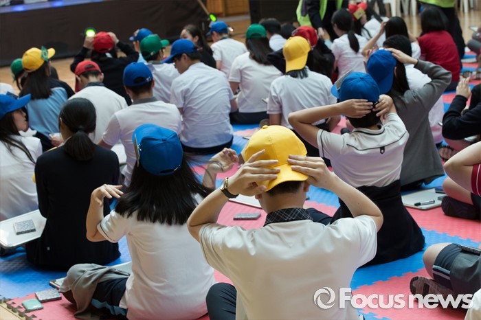 (서울=포커스뉴스) 24일 오후 서울 강북구 신일중학교 체육관에서 열린 근현대사기념관 개관 기념 '역사 골든벨'에 참석한 학생들이 본선 골든벨 퀴즈를 풀기 전 준비하고 있다.